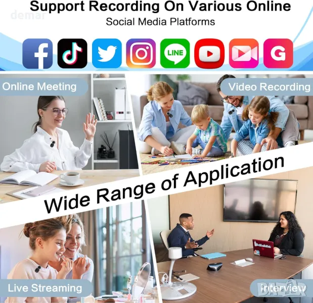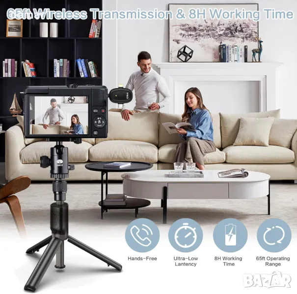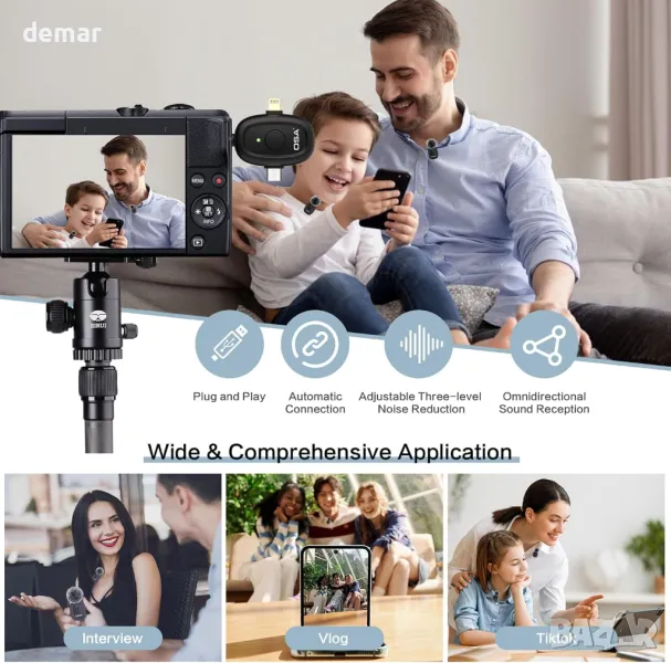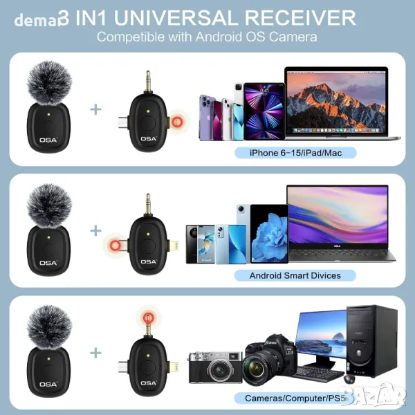 Този многофункционален микрофон разполага с универсален приемник 3 в 1, съвместим с iOS, Android, камери и компютри, позволяващ едновременно записване от два аудио източника или самостоятелно използване. Той предлага лесна функция за включване и пускане, без да са необходими приложения или Bluetooth сдвояване. С обхват от 25 метра и над 8 часа живот на батерията, той включва вградено намаляване на шума за ясно аудио улавяне. Компактният дизайн гарантира преносимост, което го прави идеален за интервюта, влогове, подкасти и стрийминг на живо. Пакетът включва два микрофонни предавателя, приемник 3 в 1, три кабела за зареждане, ръководство за потребителя, чанта за съхранение и кутия за съхранение.