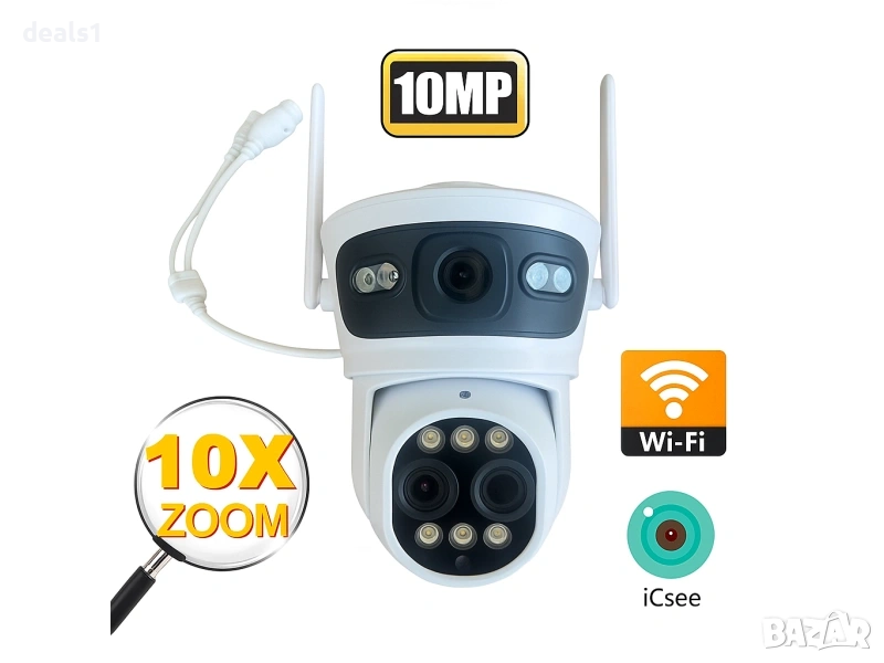 WiFi IP 10MP 10х Zoom Триобективна Камера Двупосочно аудио Цветно нощно виждане iCSee APP