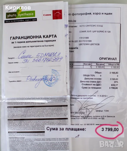 Тялото на фотоапарата е закупено от Фотосинтезис за 3799лв., за което