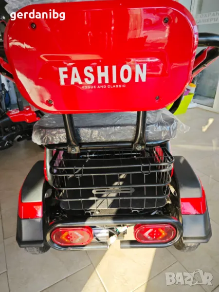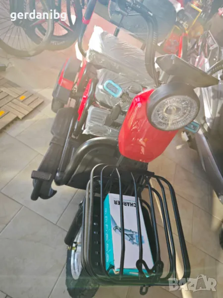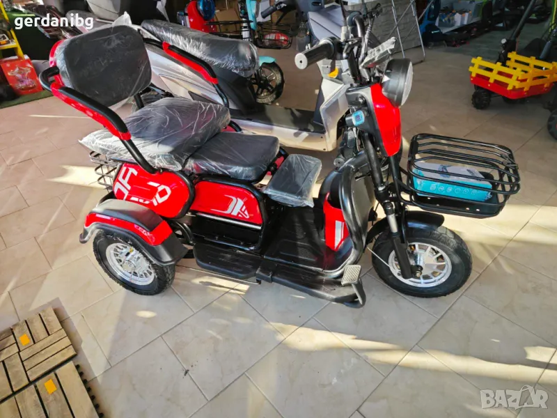 Електрическа триколка. Високопроходима с гуми 3 х 10”. Седалката се придвижва на релси. Може да се приспособи за един човек или двама възрастни с едно дете. Мощност 48V/20Аh 800W. 4 броя батерии. 3 скорости напред и 1 назад.