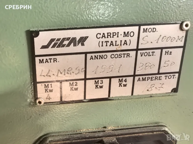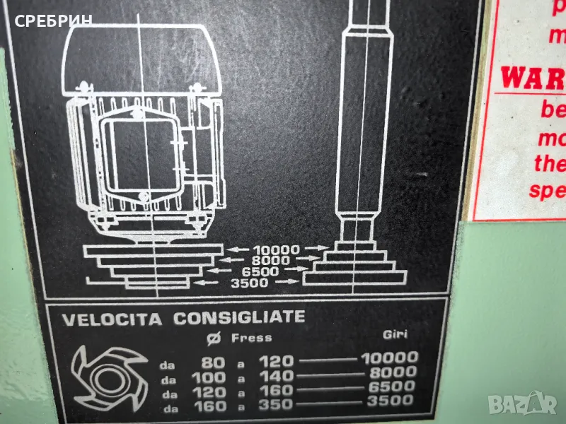 В наличност италианска фреза с карета, с 4 вида обороти, мотор 4 кв. с ел. спирачка. Височина на шпиндела 180мм, дебелина ф 30мм. Машината е в топ състояние. Ревизирана, сменени лагери на шпиндела + ремък. За повече информация по телефона. Разполагам с още 12 броя фрези на склад и други над 90 машини.Адрес село Черганово на 2 км от Казанлък срещу фабрика за дървени къщи ECOZID,, darvodelskimashini.alle.bg