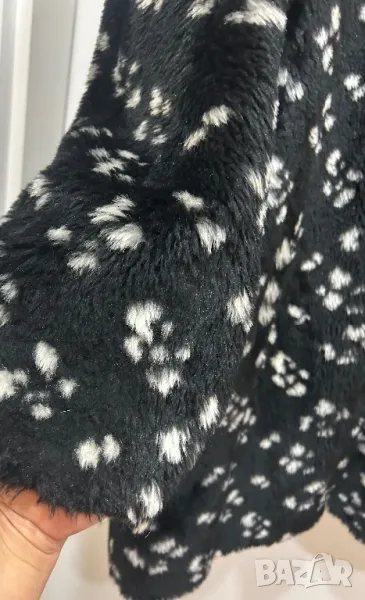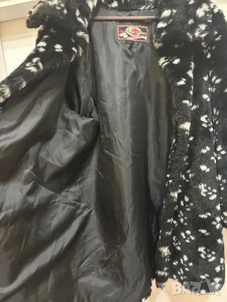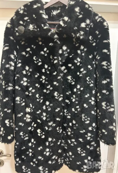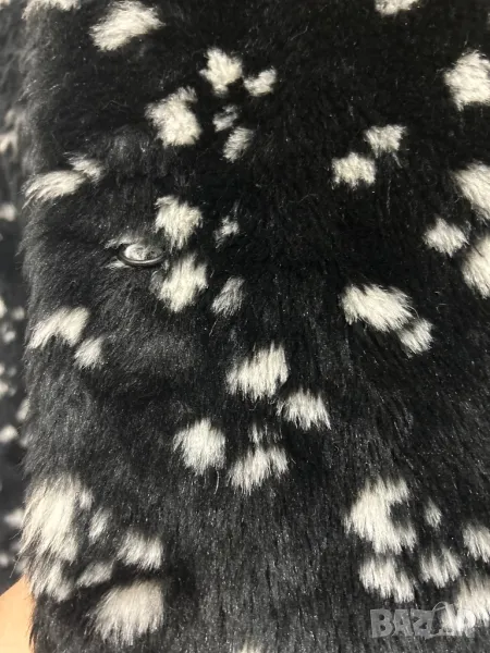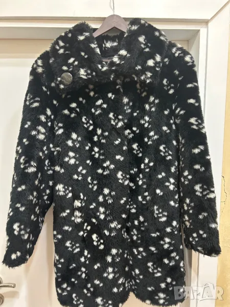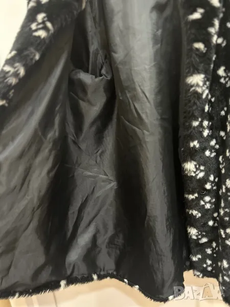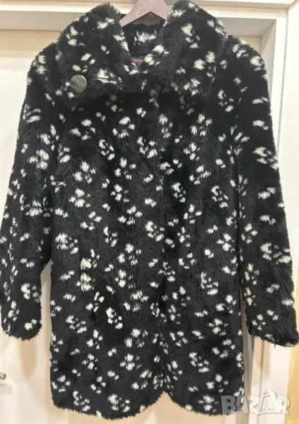 Дамско черно, топло и модерно палто от изкуствена кожа, с шарка на бели петна от марката Alex, селекция от топ 3.