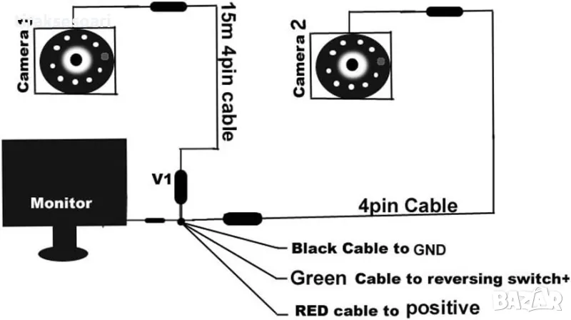 Видео: 2-канален видео вход; V1/V2 превключвател