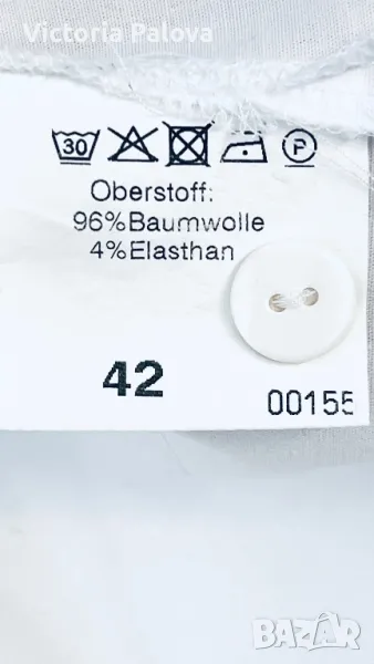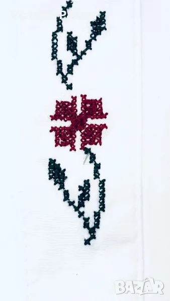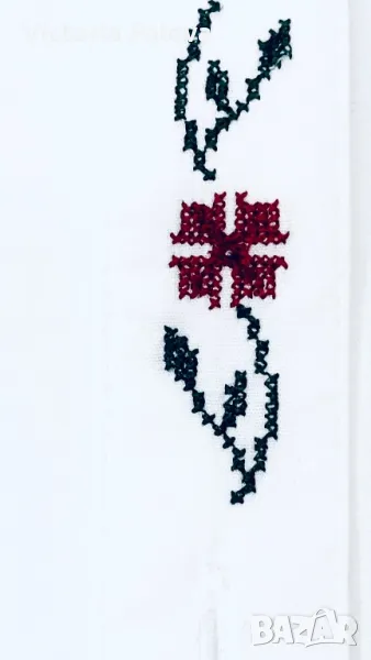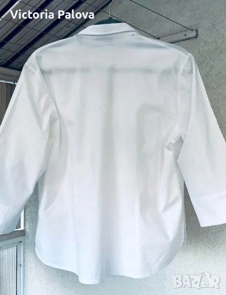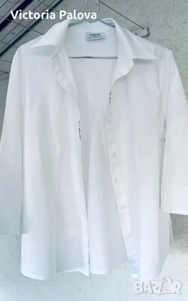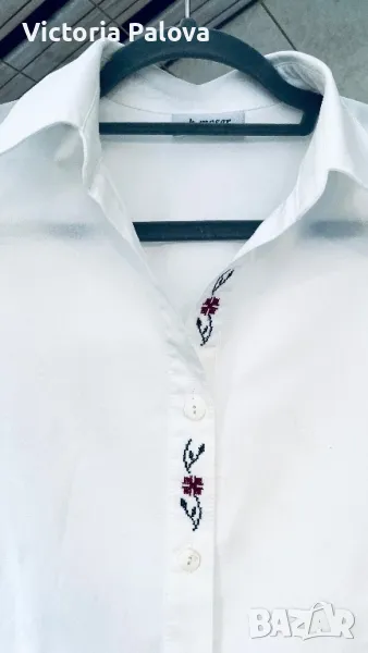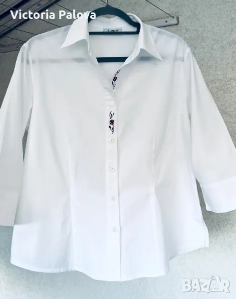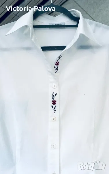 Ризата е невероятна : снежнобяла, с нежни деликатни бродерии ( ръчна изработка), цепки по ръкави и на странични шевове, леко вталена и разкроена надолу тип камбанка, има еластичност (4%).Със сигурност е рядък екземпляр, притежателката на ризата ще бъде единствена. Рамо - 46см, ГО - 56см, дължина - 62см, ръкав - 42см ( 3/4).