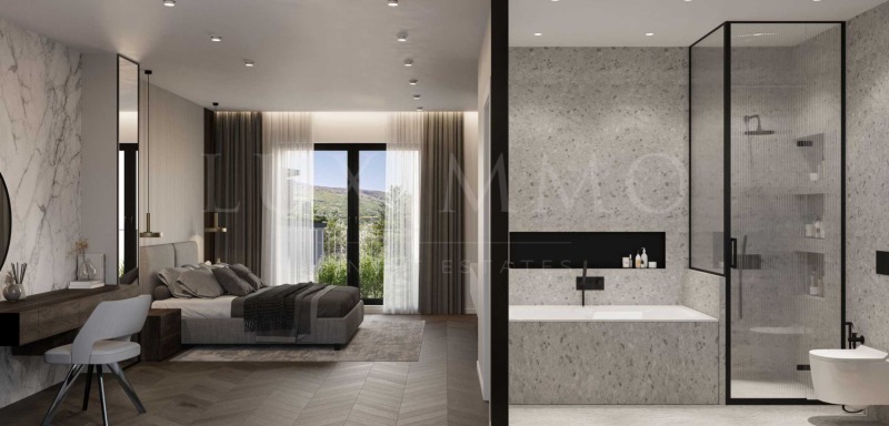 Представяме модерна къща в малък комплекс от бутикови къщи от затворен тип, разположени в подножието на планината с панорамни гледки към околността и града.