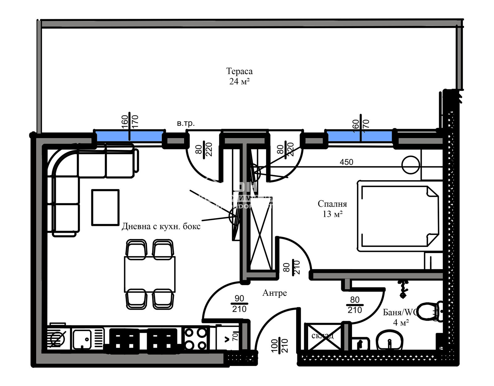 Оферта 65731:Представяме Ви новоизградена малка сграда, проектирана така, че да създаде максимален комфорт и уют в един от най- бързо развиващите се райони с лесен и удобен достъп и транспорт към центъра на Града. Жилището се състои от дневна с кухненски бокс, самостоятелна спалня 13кв.м., баня с тоалетна, килер, входно антре и една панорамна тераса 24кв.м., обща за двете стаи. Сградата се намира на тихо и спокойно място в близост до всички необходими комуникации, голям хранителен хипермаркет, Ритейл Парк , училище и детска градина. Обектът се строи от фирма с доказан опит, като разполагаме с готови сгради и можем да Ви покажем качеството на изпълнение, което се осъществява с висококачествени материали и съвременни технологии, по европейски стандарт, петкамерна PVC дограма, червена Австрийска Тухла, масивна Блиндирана входна врата с 4-странно заключване, сензорно осветление, хидравлични асансьори с огледална кабина. Свободни паркоместа!!! Възможност за Закупуване чрез Банков Кредит или разсрочено изплащане по време на строителството!!! Възползвайте се от възможността да живеете в малка сграда на спокойно място!!!