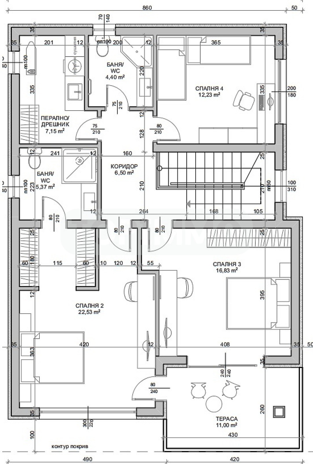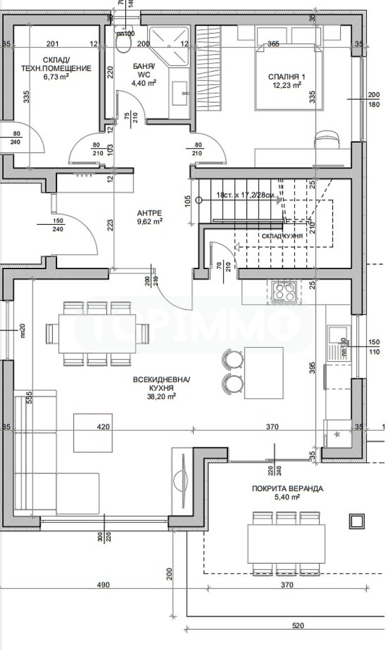 Къщата е проектирана с просторни и светли помещения, осигуряващи максимална функционалност и комфорт. Първи етаж се състои от входно антре, всекидневна с кухненска част, от която се излиза на покрита веранда, спалня, баня с тоалетна, складово помещение. Удобно стълбище отвежда към втори етаж, където са разпределени 3 спални, едната с тераса, баня с тоалетна и перално помещение/дрешник.