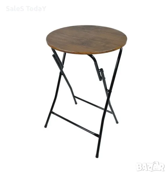 Кръгла сгъваема маса със заключващ се отвор. Изработен от стомана и повърхността е от дърво (MDF), има предпазители за крачета, за да не оставя следи по пода и лесно затваряне.