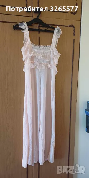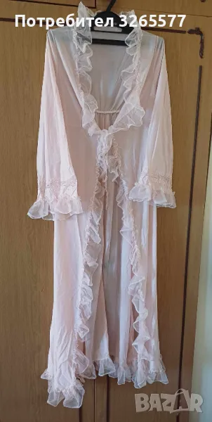 Продавам дълга розова дамска нощница с халат.Стояла е прибрана. Много нежна и лека. Размери: Нощница - гръдна обиколка - 80см, дължина - 124см.Халат - Гръдна обиколка - 84см, дължина - 124см.При тези размери не съм сигурна че е L.
