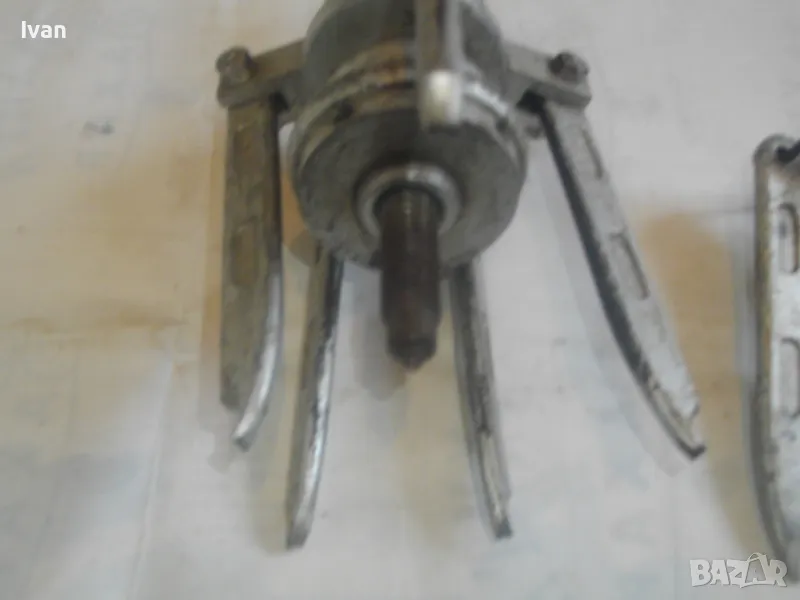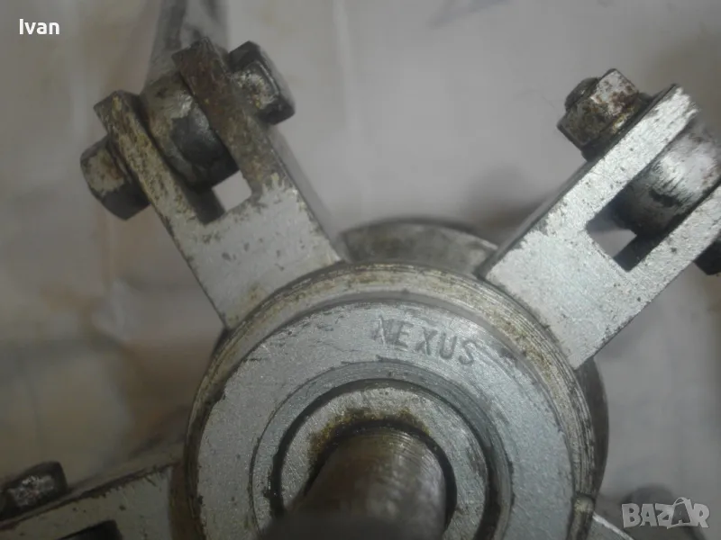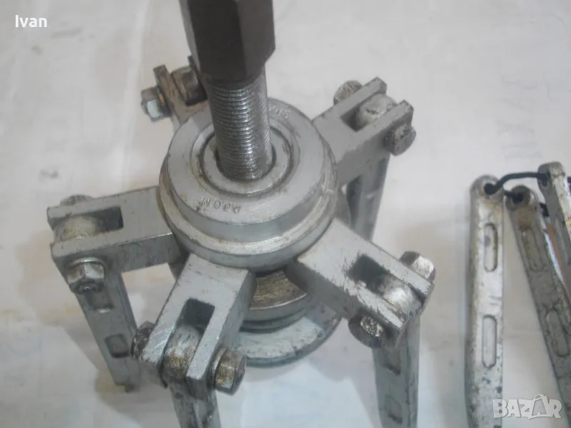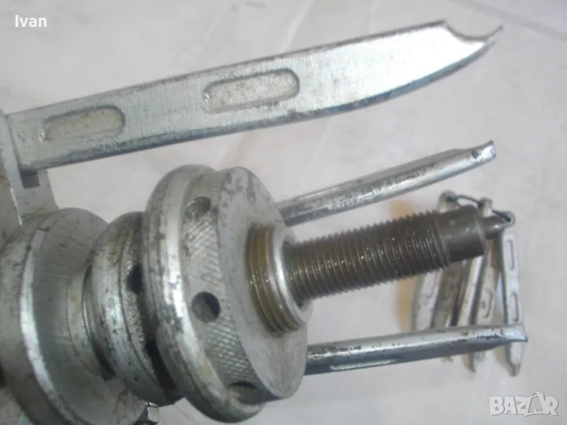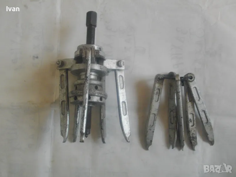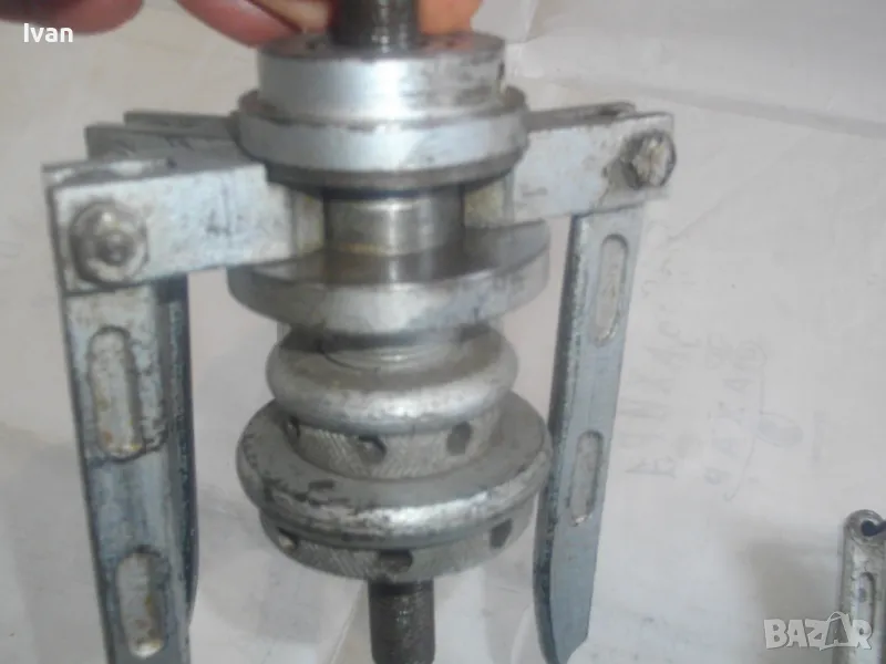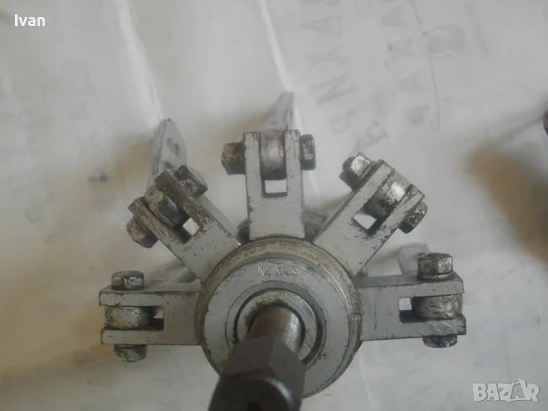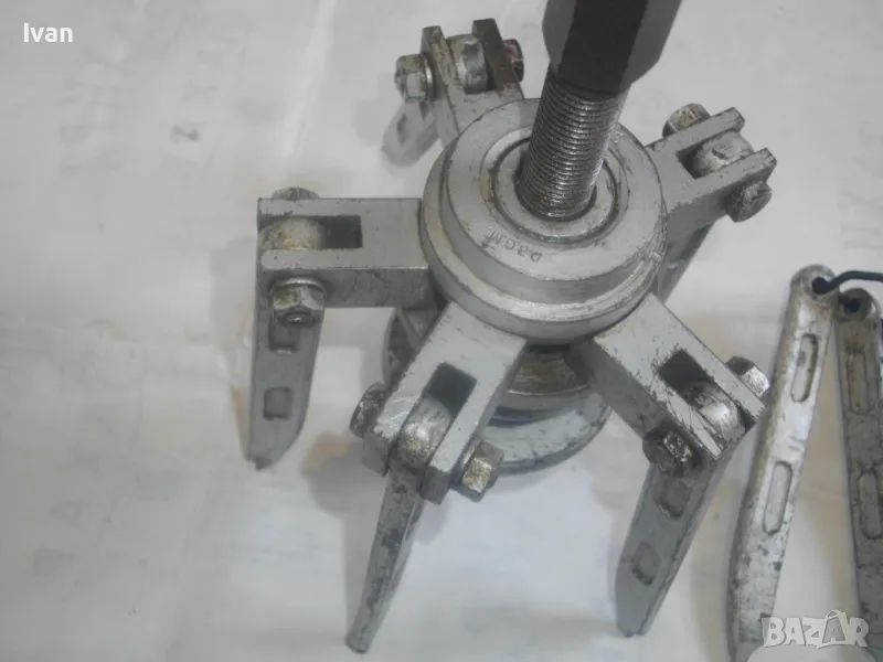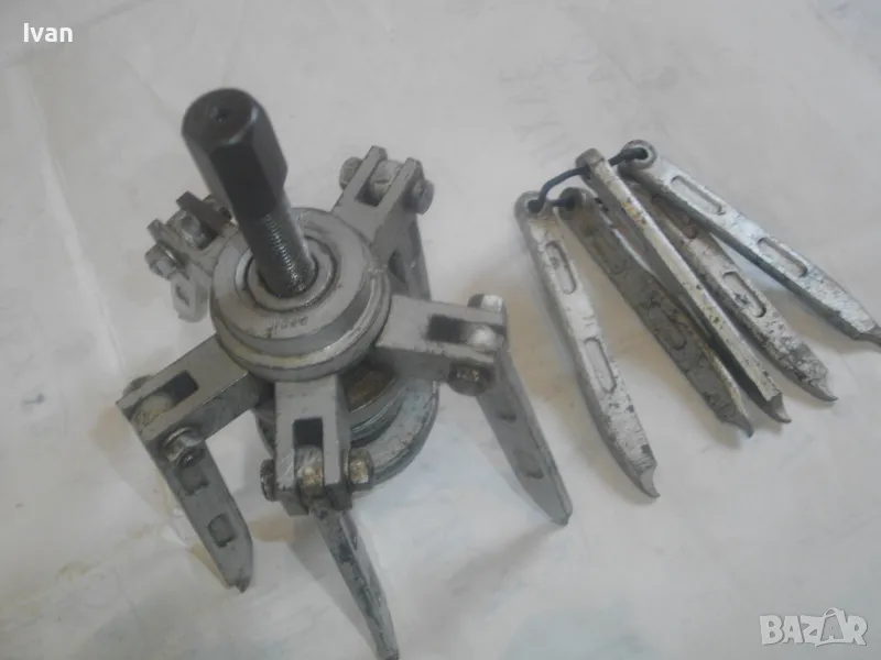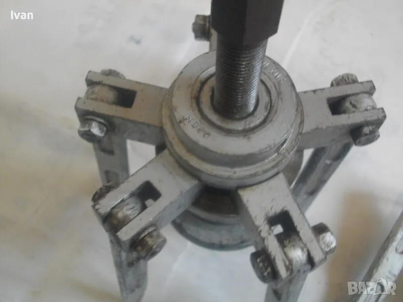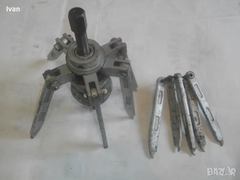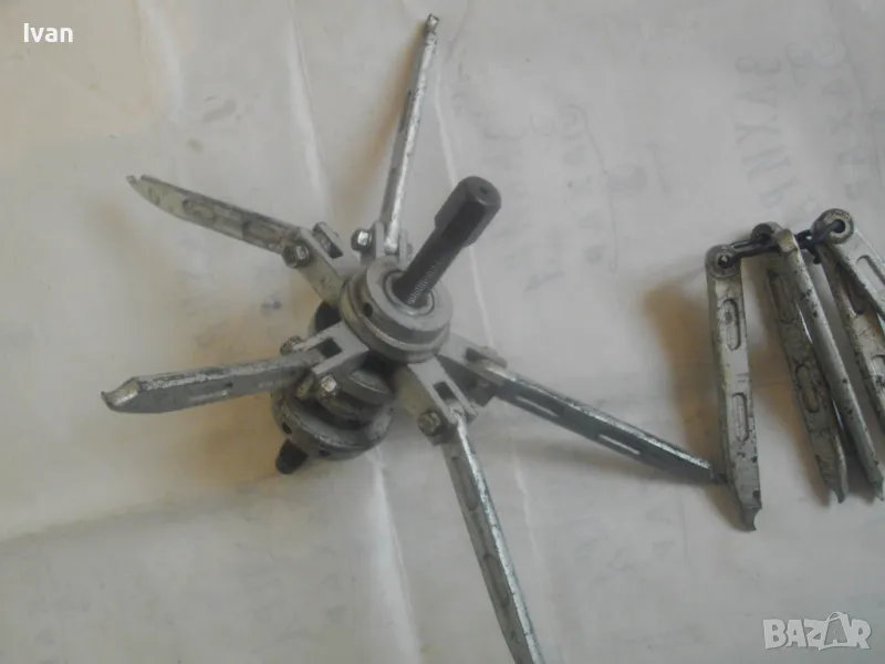 Скоба за вадене НА ЧЕРУПКИ НА ЛАГЕРИ - петраменна - с 5 налични рамена и резервен комплект щипки рамена още 5 бр. Цена на скобата - 399 лв. Професионална. За вадене на черупките на лагери, Старо масивно качество. Предполагам немска или нидерландска/холандска. Маркировки на главата на скобата за марка и модел NEXUS D.B.G.M. Скобата е с 5 подвижни рамена, които могат да се придвижват за наместване и захват на чурупката на лагер. Крайщата на рамената са остри, обърнати навън за захват на черупката, не на вътре за захват на целия лагер. Подвижните глави на рамената могат да се завъртват към основтата глава отгоре. Винта на скобата е с 2 стягащи кръгли глави за наместване и обхващане на чурупка на лагер. Дължина на винта - 215 мм, шестостенен М16. Дължина на рамената - 135 мм. Към скобата има 5 броя резервни рамена. Тегло на скобата с резервните рамена 2,0 кг. Материал - масивно желязо.