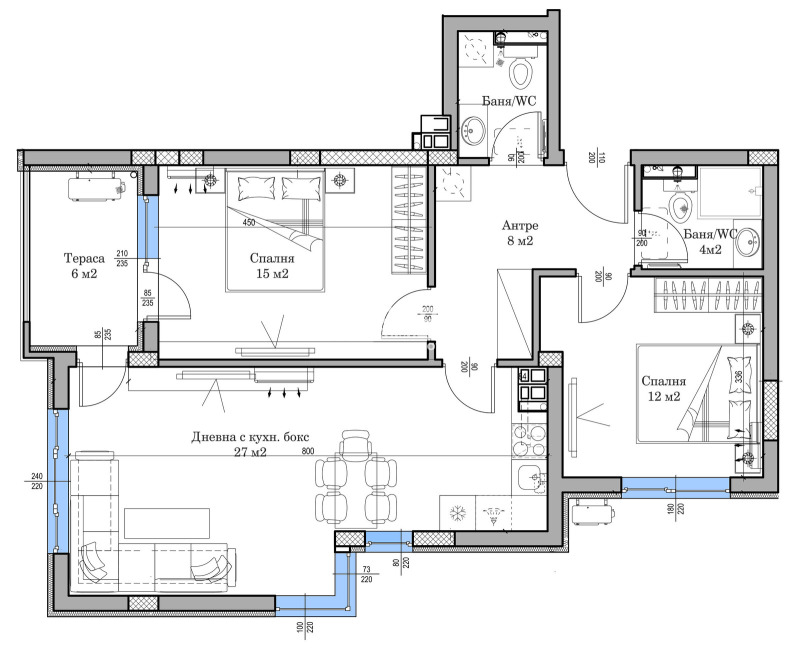 Оферта 65695: Представяме ви новопостроена сграда със собствен стил с изчистена и модерна визия, проектиран така, че да създаде максимален комфорт и уют за живеене. Съчетанието на модерен дизайн и форми с уникално разпределените апартаменти прави обекта изключително привлекателна инвестиция. В сградата има 21 апартамента всеки от тях с функционално разпределение. Проектираните жилища са с квадратури от 57 кв.м до 127 кв.м. Апартамента се състои от дневна с кухненски бокс- 27кв, две спални по 15кв и 12кв, две санитарни помещения и тераса. Отличаващото предимство е площта на жилищата, които са изключително просторни. Изпълнението ще се осъществява с висококачествени материали и съвременни технологии, по европейски стандарт, шесткамерна PVC дограма троен стъклопакет, блиндирана входна врата с 4-странно заключване, сензорно осветление, хидравлични асансьори с огледална кабина, HPL панел !!! Осигурено е паркирането чрез възможност за закупуване на гараж или паркомясто в надземно ниво и подземен паркинг на сградата. Приложените снимки са от готови сгради на строителя.