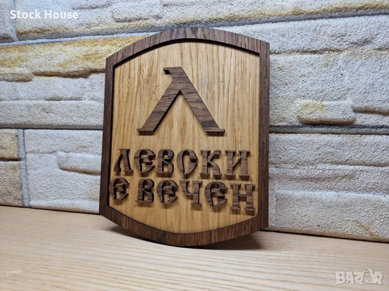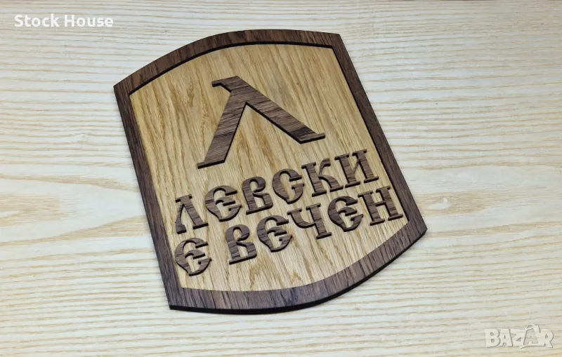 Декоративна табела с емблемата на футболен клуб Левски, изработена ръчно от дървесина.