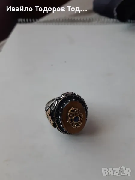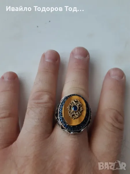 Продавам унилален бутиков мъжки масивен сребърен пръстен с позлата, тежащ 19 грама и с размер: 66. Камъка е тигрово око. Малките ръчно редени камъчета са аквамарини . Безкомпромисна изработка от Венеция, Италия.