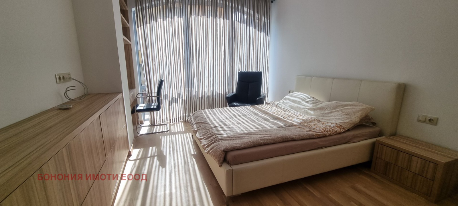Изключително жилище в затворен комплекс 'ФеърПлей', в един от най предпочитаните райони на гр. София, напълно обзаведен, разпределен върху 195 кв.м. застроена площ, на среден етаж, изложение юг/изток. Жилището е със следното разпределение: три непреходни спални по 16-17 кв.м., една от спалните разполага със собствена голяма баня с санитарен възел, гардеробна, както и голяма слънчева тераса от 13 кв.м., дневната е с площ от 70 кв.м., продава се напълно обзаведен, отоплението е централно на ТЕЦ, в цената са включени два броя подземни парко-място. Огледи с предварителна уговорка с КЛЮЧ.