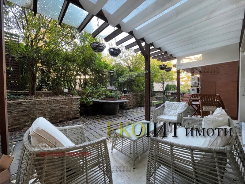 Личният двор е оборудван с пергола, външно барбекю-огнище, градинска мека мебел, трапезна маса, столове и градинска декорация.