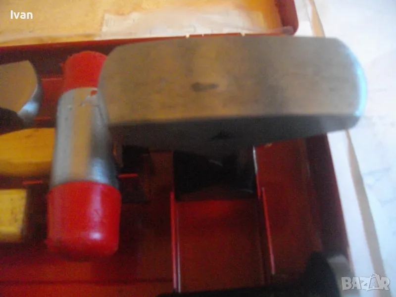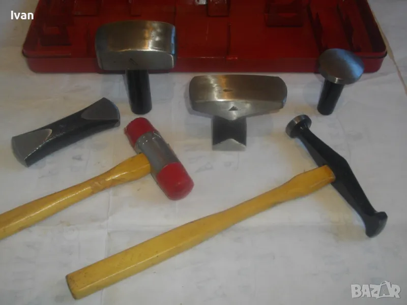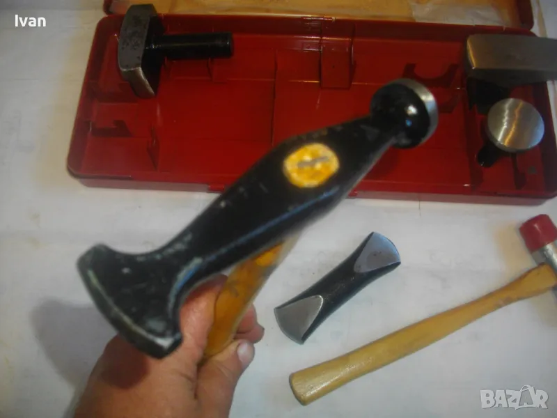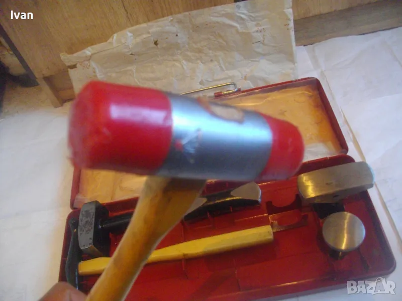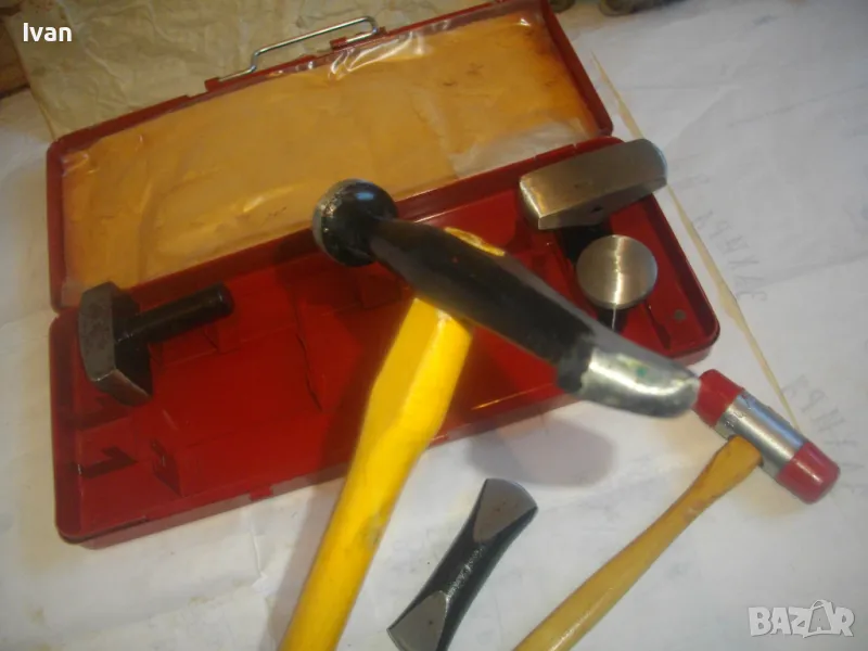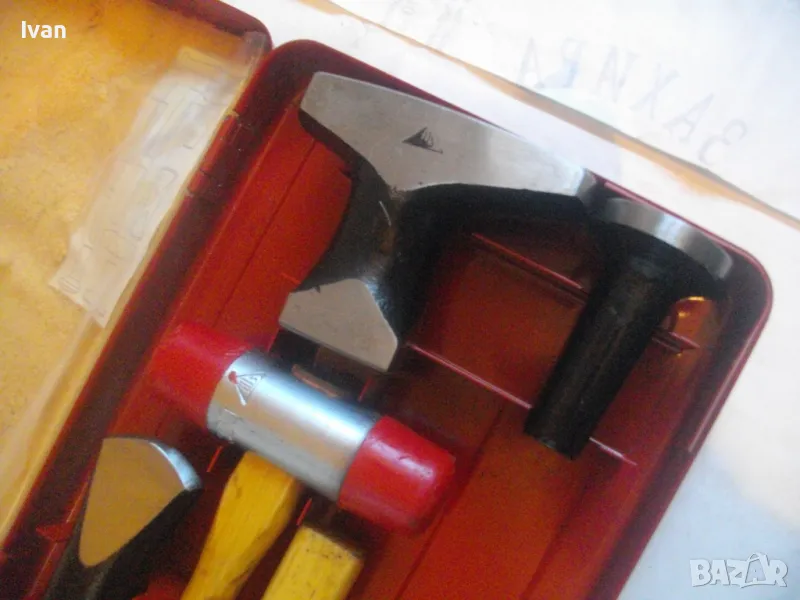 тенекеджийски чукове и наковални - старо качество ФРГ Smalcalda висок клас в метален червен куфар - цена 229 лв. Тегло на комплекта - 6,0 кг. Кутия метална с метална копчалка и размери 460 х 200 х 70 мм. Чукове - 2 броя ралични, наковални 4 броя различни. Всичките наковални и единия чук са съвсем нови, неизползвани, другия чук с червените крайща е ползван. Метала на наковалните е масивен, плътно желязо, закалено. Всички компоненти имат логото на западногерманския производител на профи инструменти Smаlcalda. Кутията също е с логото на марката. Кутията е с дунапренена подложка на горната си част върху инструменталиума. Цена на комплекта - 229 лв.