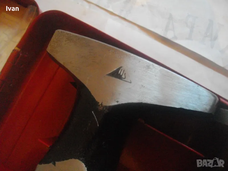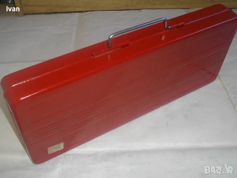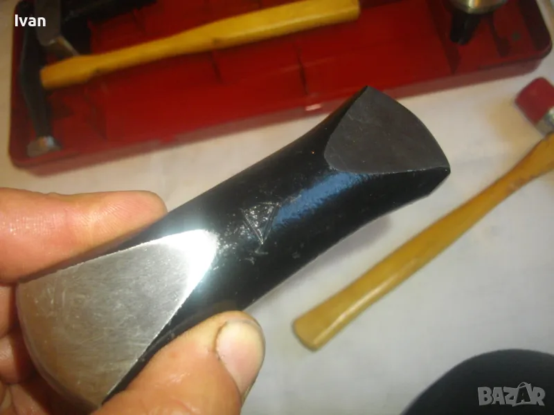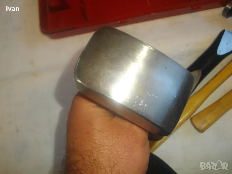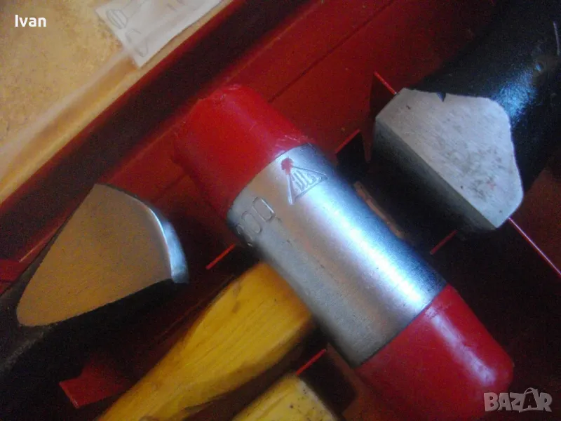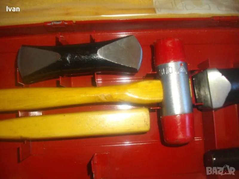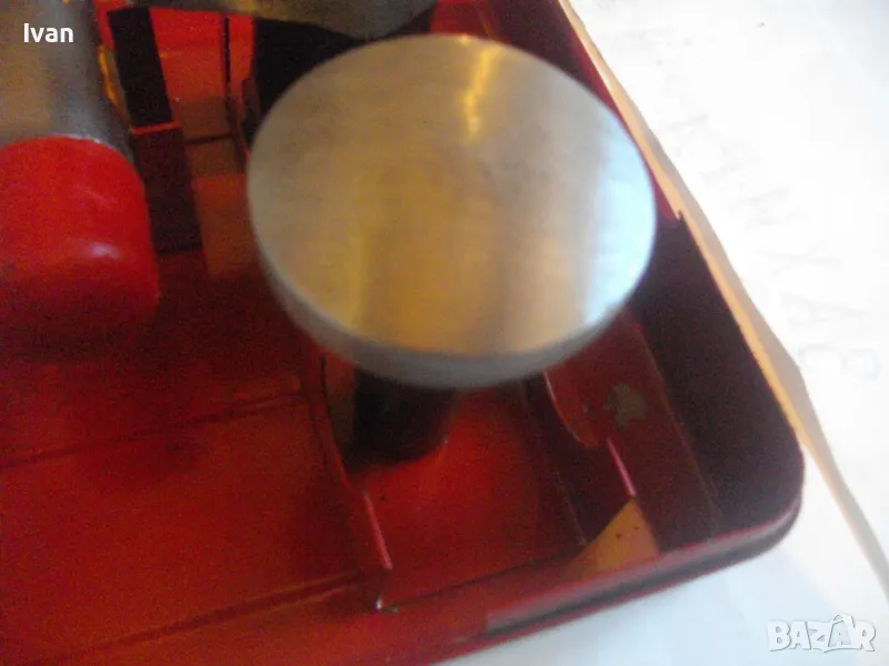 тенекеджийски чукове и наковални - старо качество ФРГ Smalcalda висок клас в метален червен куфар - цена 229 лв. Тегло на комплекта - 6,0 кг. Кутия метална с метална копчалка и размери 460 х 200 х 70 мм. Чукове - 2 броя ралични, наковални 4 броя различни. Всичките наковални и единия чук са съвсем нови, неизползвани, другия чук с червените крайща е ползван. Метала на наковалните е масивен, плътно желязо, закалено. Всички компоненти имат логото на западногерманския производител на профи инструменти Smаlcalda. Кутията също е с логото на марката. Кутията е с дунапренена подложка на горната си част върху инструменталиума. Цена на комплекта - 229 лв.