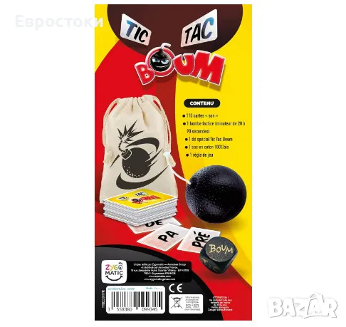 Тази скоростна игра на думи съдържа 110 „звукови“ карти, манекен бомба (таймер от 20 до 90 секунди), специален зар Tic Tc Boum, 100% памучна чанта за съхранение и правилата. Страхотен формат за пътуване, лесна за транспортиране с чантата за съхранение.