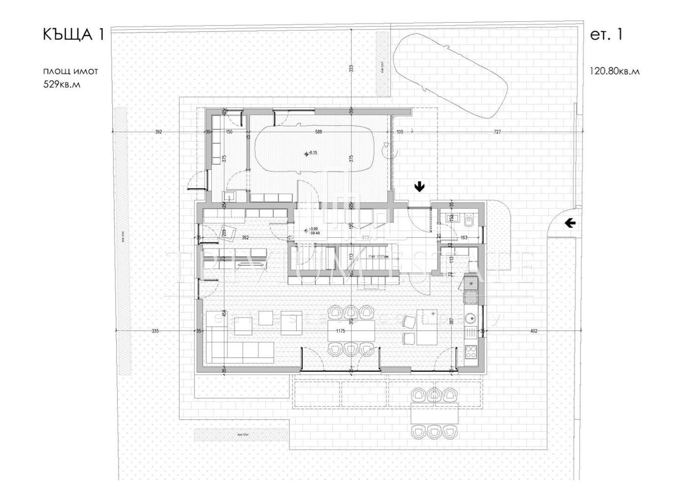 1-во ниво: просторна дневна с кухня и трапезария с излаз на прекрасна веранда, тоалетна, офис помещение, входно антре и гараж, който е с топла връзка към самата къща. Има допълнителна възможност за паркиране на още два автомобила.