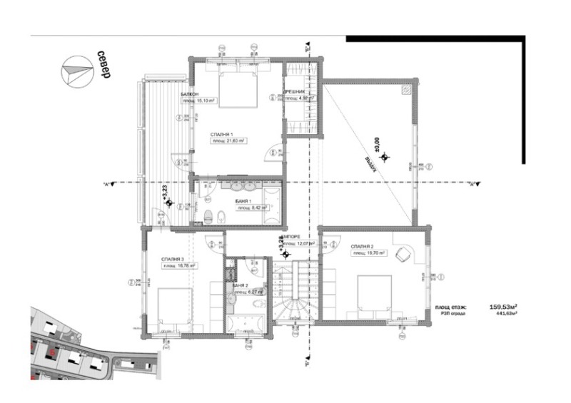 Разпределението включва: сутерен, първи и втори етаж .