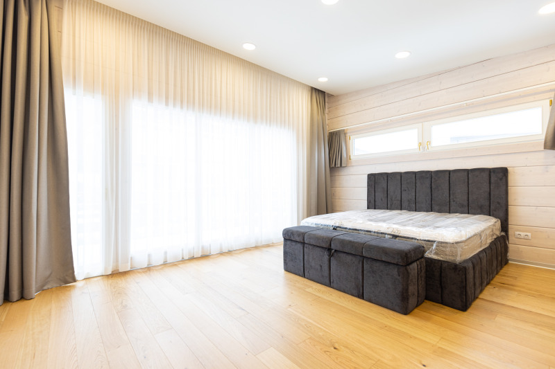 Втори етаж: височина на таваните на места до 3,30м. На него са разположени коридор три големи спални с правилна форма, като едната има собствен дрешник 8кв.м. и баня 9 кв.м. и още една баня, обслужваща другите две спални. Две от спалните излизат на голяма тераса на юг с гледка към Витоша планина.