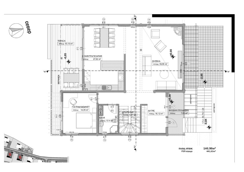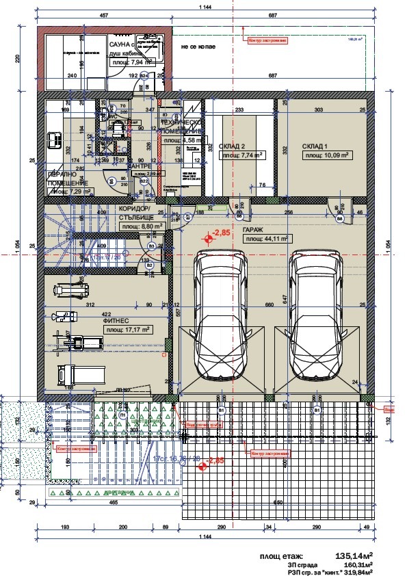 Сутерен: височина на таваните 2,70 метра, гараж за два големи или три по-малки автомобила, техническо помещение, складови помещения, перално с достатъчно място за сушене на дрехи, фитнес зала (може да е билярдна, кабинет, киносалон и др.), душ кабина и място за сауна или парна баня. На нивото на сутерена има още две открити паркоместа.