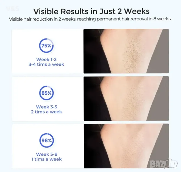 Устройство за епилация с 2 режима: Ръчният режим се използва главно за премахване на подмишници, пръсти, бикини линия, устни и други малки деликатни зони. Автоматичният режим може да се използва за големи зони, като ръце, крака и епилация на гърба. Можете да използвате това върху лицето си за множество ползи за кожата по време на използване на машината за епилация. Фини линии, с течение на времето тяло без коса.