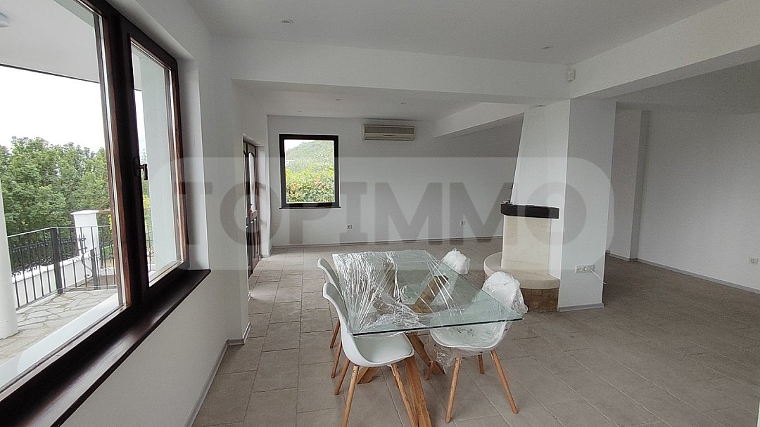Първи етаж: просторна дневна с кухня и трапезария с камина, мокро помещение за пералнята, килер, малко предверие и тоалетна. Помещението е с монтирана кухня и климатик.