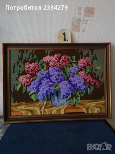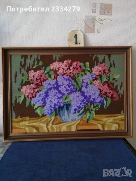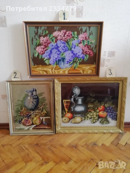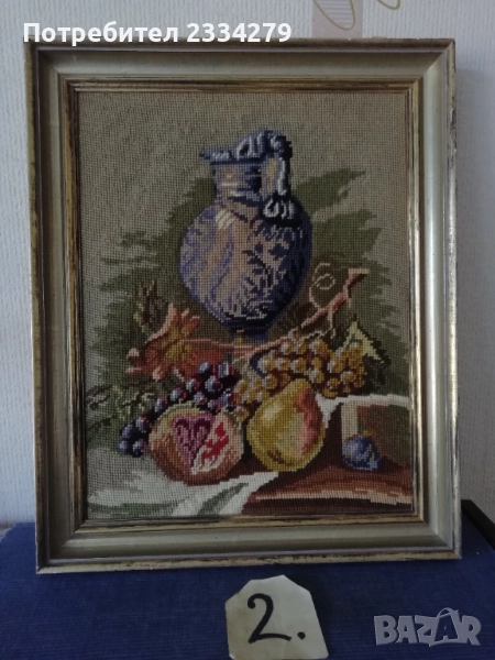 N:1 стар гоблен ,,ВАЗА С ЛЮЛЯЦИ" натюрмор, разпънат на орнаментирана рамка с размери 57х40см., цена 23€.; N:2 стар гоблен натюрмор ,, МАСА С ПЛОДОВЕ" разпънат на орнаментирана дървена рамка с размери 47х38см., цена 18€.;