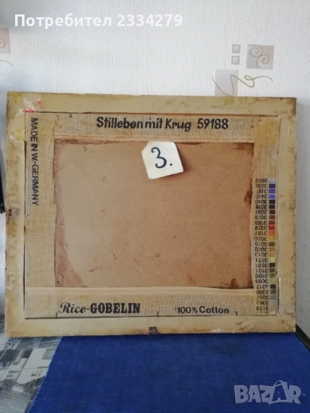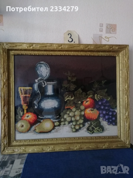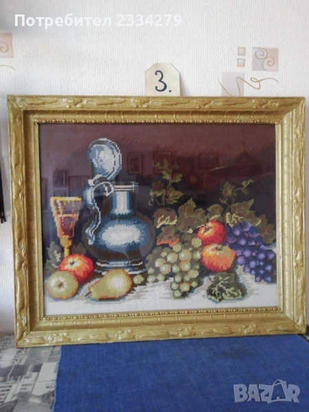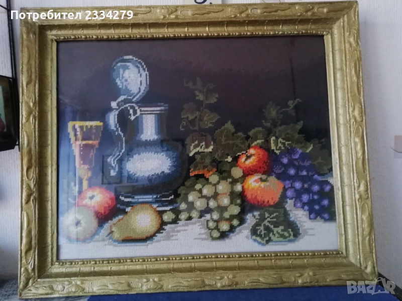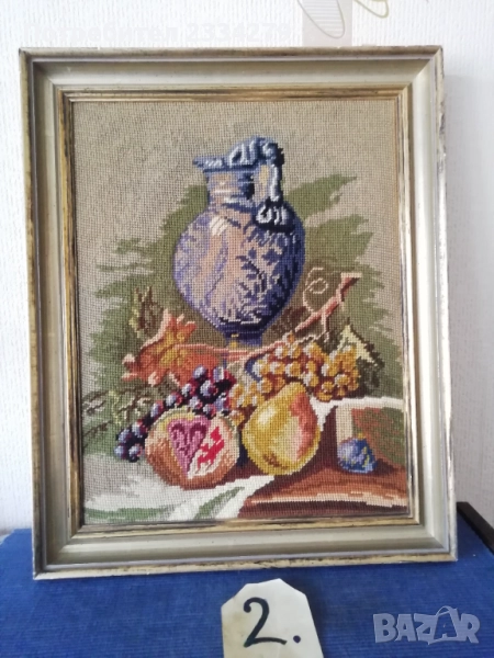 N:3 красив гоблен натюрмор, ръчно изработен с памучни конци и разпънат на стара остъклена дървена рамка в бароков стил, размери 60х50см., цена 37€. Красива запазена декорация за дом, офис, заведение, вила, битова къща.