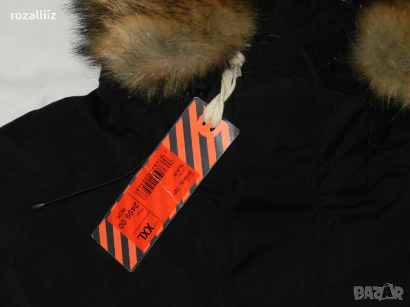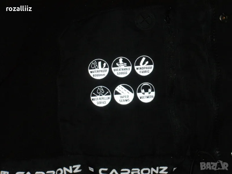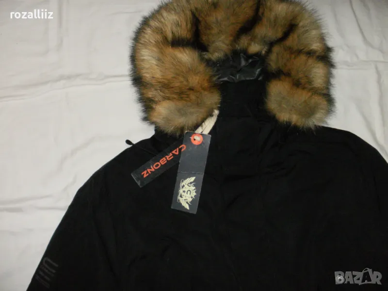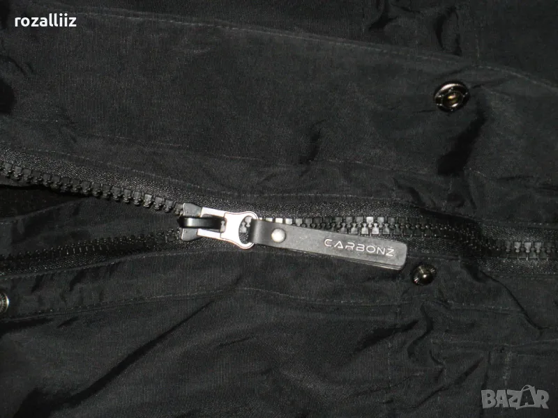 Якето е на CARBONZ, оригинално, ново с етикети. По номер е XXL, цвета е черно, материята не пропуска дъжд и вятър. Пълнежа е силиконова вата. Закопчава се със стабилен двоен цип. Отпред долу има два двойни джоба, горе също има два джоба, има и един вътрешен. Пухчето на качулката се сваля, долу и на качулката има ластик със стопери. Има лого на ръкава и на капсите.