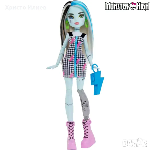 Куклата Frankie Stein™ се разхожда по коридорите на Monster High™ по наелектризиращ начин в къса рокля с щампа на пъстри цвят с илюстрации на розови светкавици.
