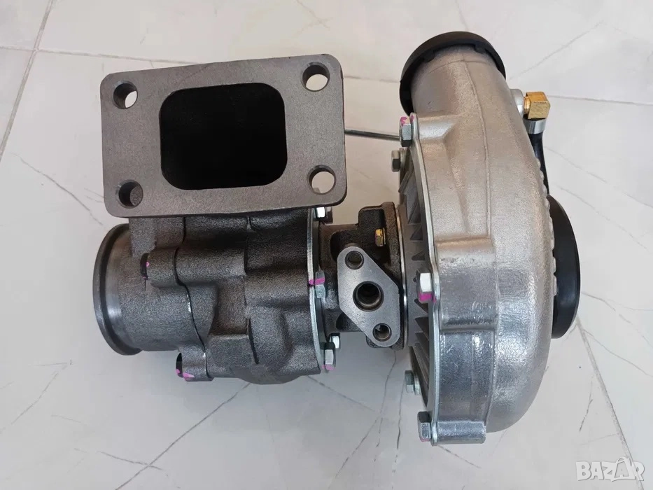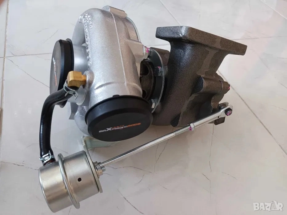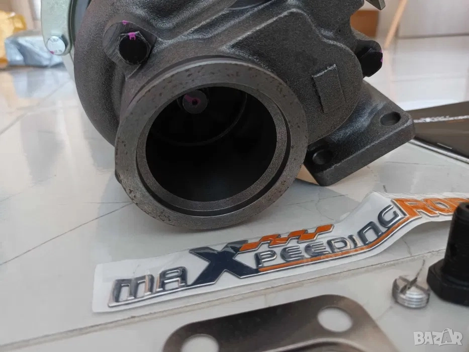 Продавам Турбина Т3-Т4 Т04Е с вграден гейт, V-банд скоба, фланец за даунпайпа, гарнитурки комплект, рестриктор и банджо болт с отвор за високото налягане на маслото. Подходяща за сетъпи до около 420 коня. Снимки 1, 2, 3, 4 и 5