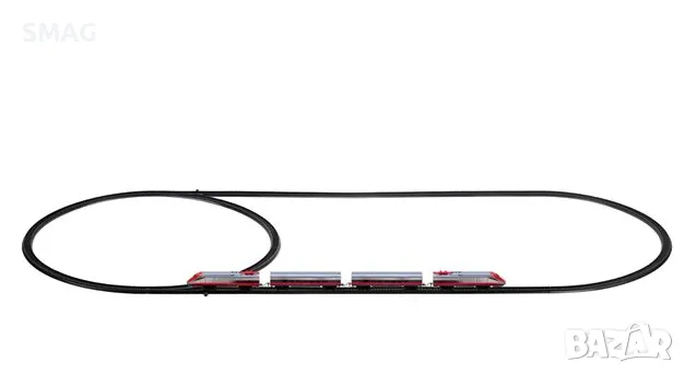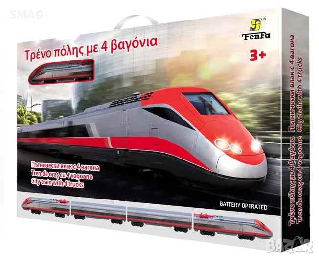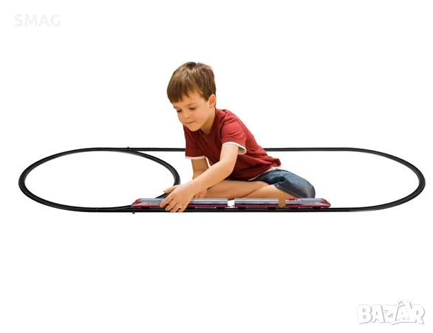 Играчка за момче, градско влакче 4 големи вагона. Релсите са овални 118x58cm & 136x58cm, кръгли 58cm, квадратни 78x78cm или оформени 118x78cm & 98x78cm. Работи с 1 AA батерия (не е включена).