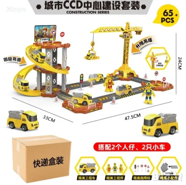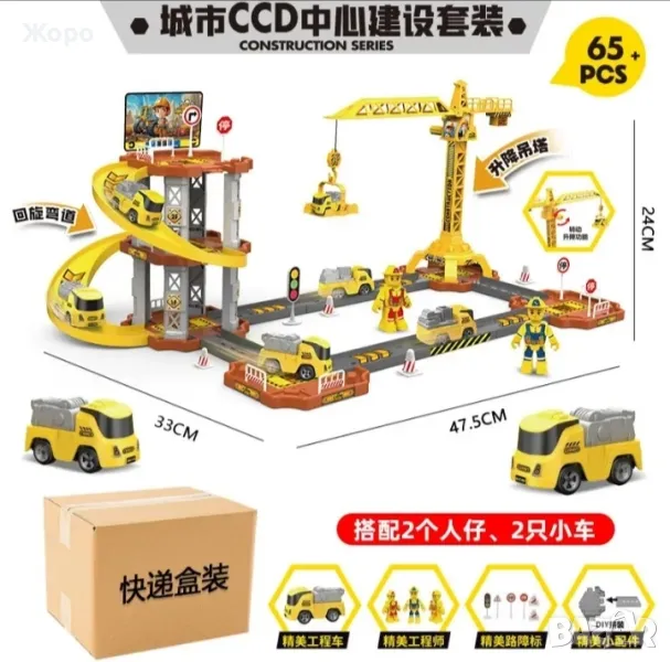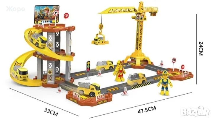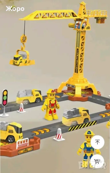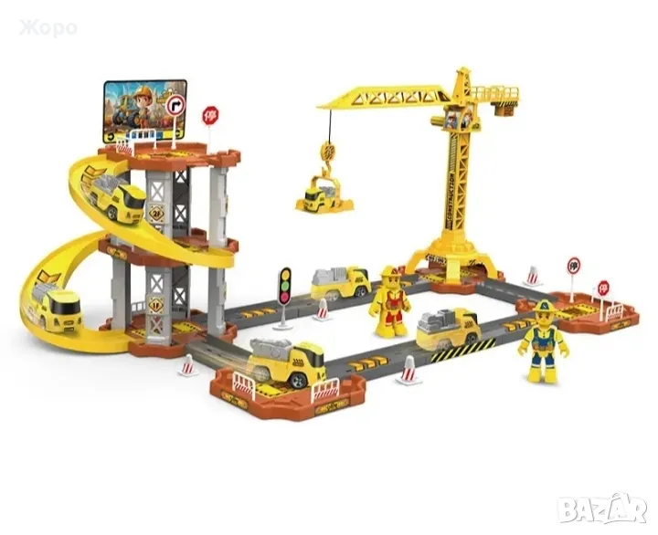 Страхотна детска играчка,пълен комплект строителна площадка с кран и писта с строители ,пътни знаци и камиони