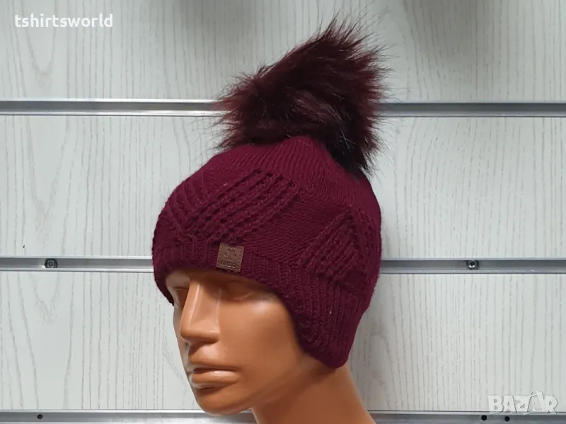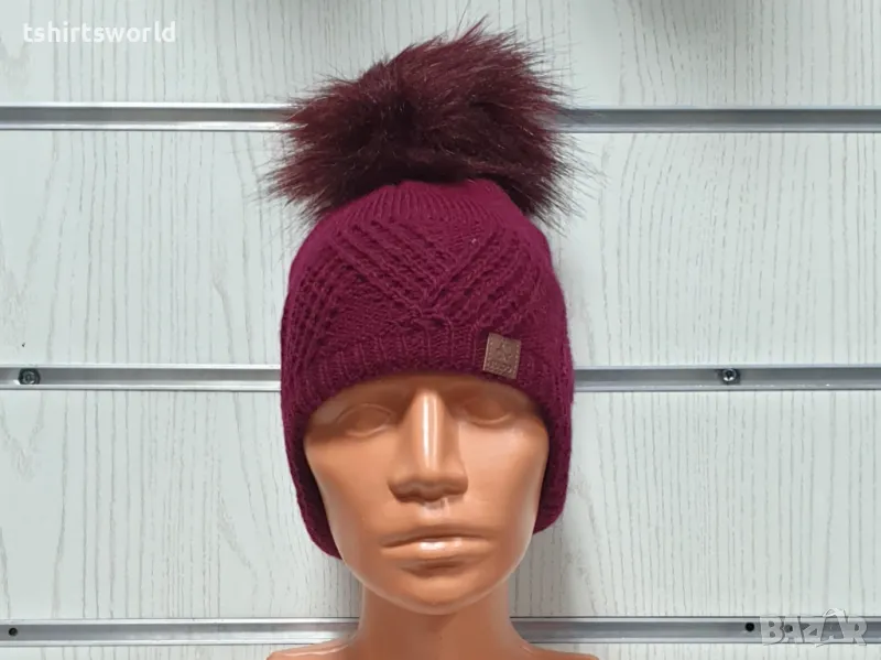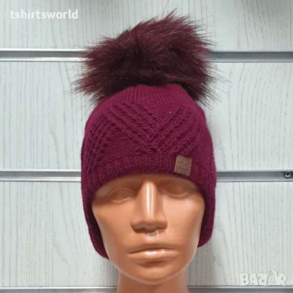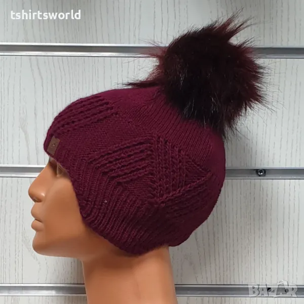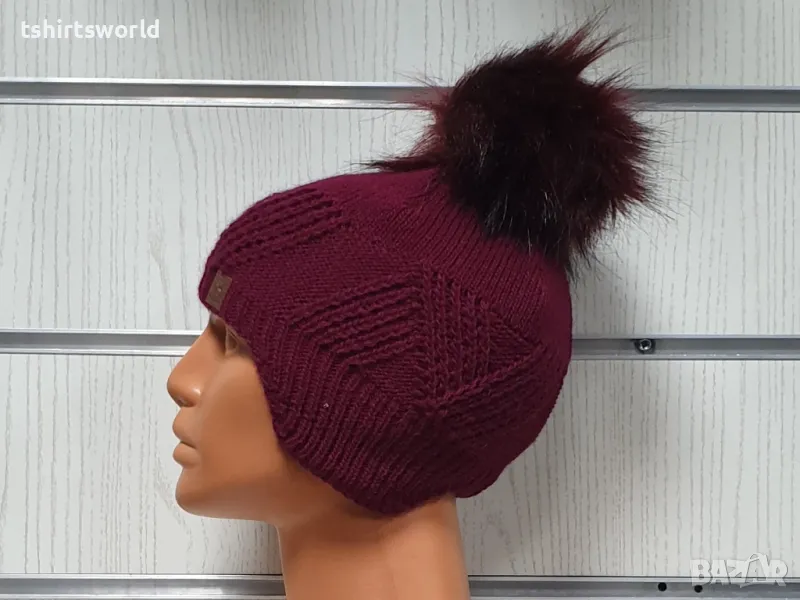 Уникална, функционална, универсална, стилна и модерна нова зимна детска шапка тип ушанка с помпон/пух в цвят бордо.