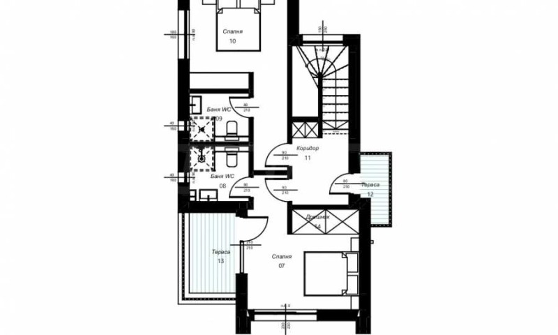 Втори етаж: две спални със собствен санитарен възел, дрешник, две тераси.