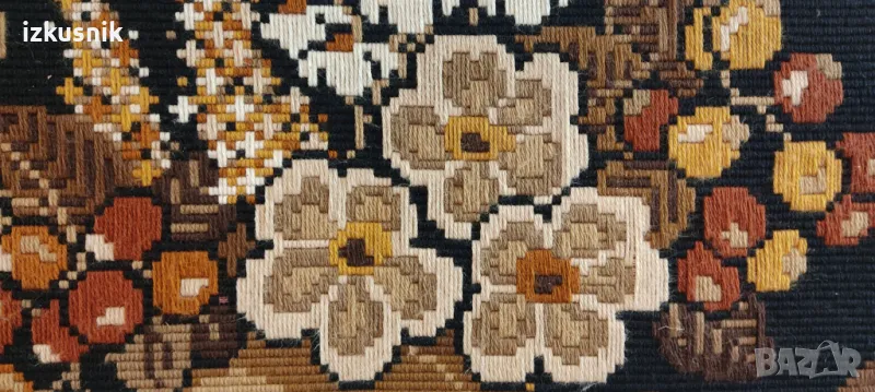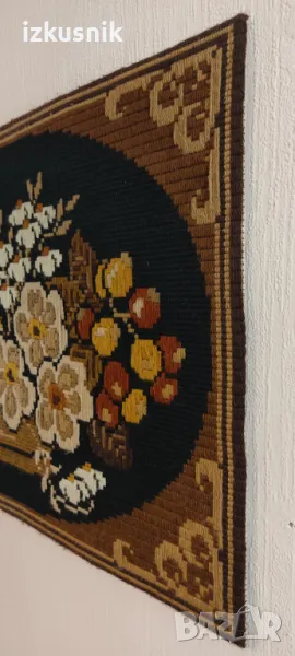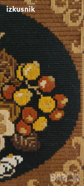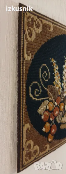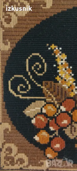 Голямо, красиво стенно пано, ръчно изработено, вероятно през 80-те години на миналия век от 100% естествена вълна. Изобразява стилизиран есенен натюрморт. Размерите са 60 Х 80 см. Масивно и стабилно, изпънато върху дървесна плоскост.