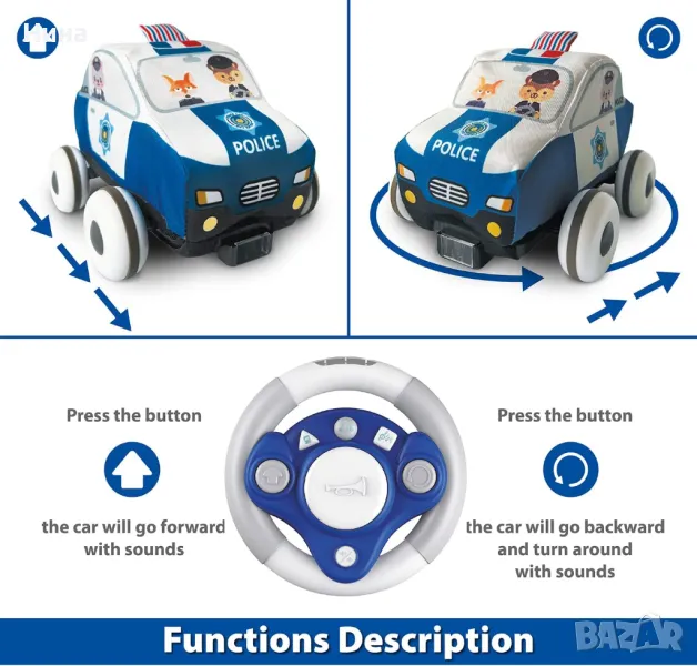 Мека полицейска колс - малките ще се забавляват много, играейки с тази водоустойчива кола, която има вградени светлини и звуци, за да улесни ученето на дете. Колата ще може да се движи напред/назад, надясно/наляво, да се върти на 360°; Благодарение на бутоните на контролера, в допълнение, вашето дете може да научи нови песни, да възпроизвежда звуци, които ще направят играта по-забавна от всякога.