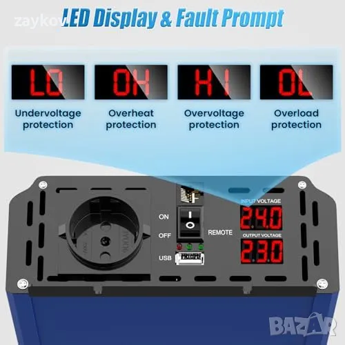 【LED индикатор и дистанционно управление】 LED екранът показва входното напрежение, изходното напрежение, а светлинният индикатор ви позволява да проверите дали инверторът е в необичайно състояние (зелената светлина е нормална, червената светлина е необичайна); инверторът е снабден с 4.5м дистанционно управление, осигуряващо удобен режим на работа.