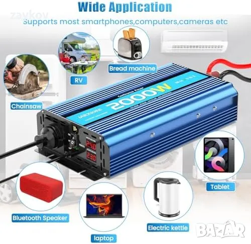 【Широко използван】 Инверторът е вид електрически уред, който може да се използва навсякъде, дори ако сте далеч от захранването, идеален за лаптопи, вентилатори, хладилници, чайници и игрови конзоли, оборудване за къмпинг, както и каравани, камиони, автомобили, соларни системи и други аварийни ситуации.
