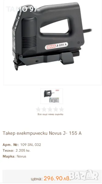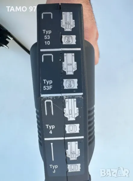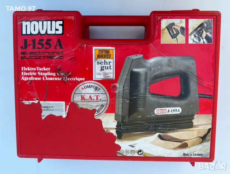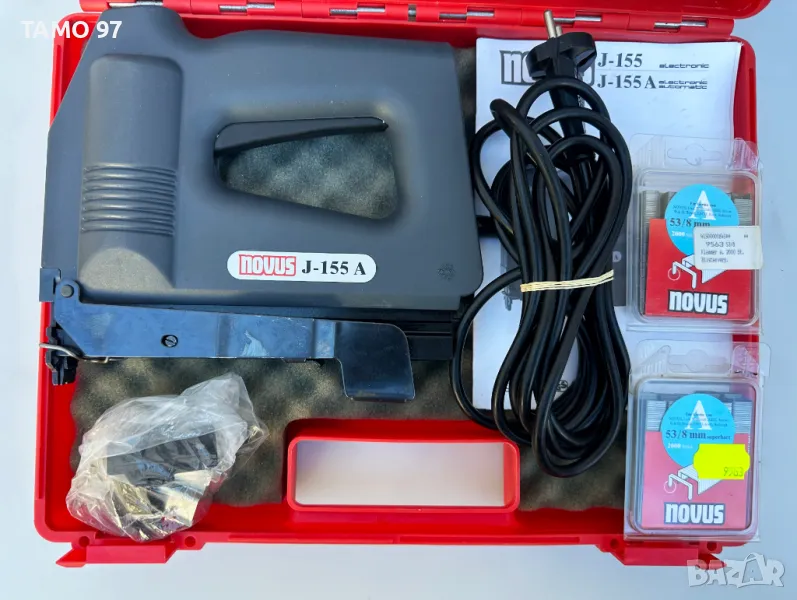 електрически такер на NOVUS с регулатор за силата на удара. Машината е неразличима от нова, както се вижда на снимките и използвана е броени пъти в домашни условия. Обявената цена вкючва машината с 3бр. приставки за различни видове консумативи, 2 кутии консумативи и оригинален куфар за транспортиране.