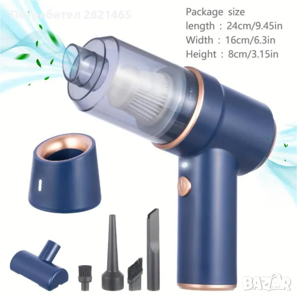 - Много удобна за носене със смукателна мощност от 9000 Pa. Снабден с 4 различни дюзи и 2 четки, той е подходящ за почистване на малки пространства като плъзгащи се врати, прозорци, чекмеджета, компютърни блокове, коли, дивани, клавиатури и др. Това прави почистването ви по-лесно и по-ефективно