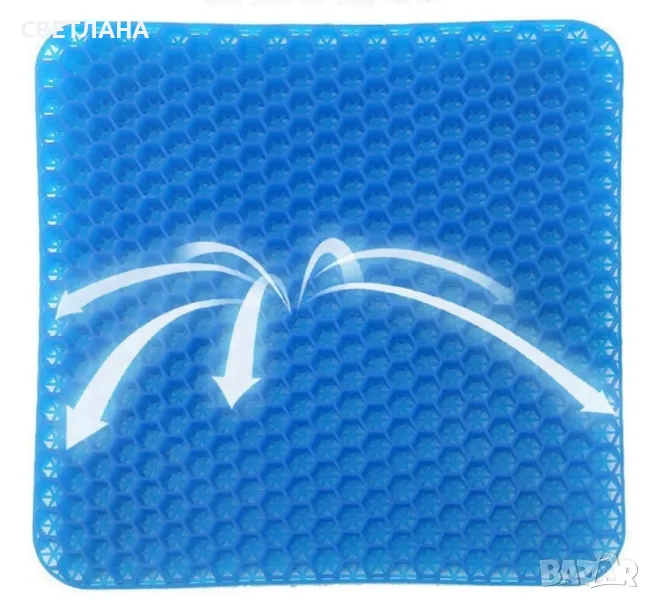Ортопедична гел възглавница за стол Egg sitter💥Тази подложка прави удобна всяка повърхност !Идеална е за дома и офиса, а защо не и за колата ?Насладете за на удобство, където и да отидете.Новата Honeycomb технология позволява циркулирането на въздуха .Подложката е силна и издръжлива, подходяща за повечето стандартни модели столове.Създадена е по специална гел формула, чрез която подложката не губи формата си.Когато седнете на нея тя нежно обгръща тялото Ви и създава комфорт при продължително седене.Материал - пяна от студен гелПодпомага лечението на различни видове болки в долната част на гръбната , схващания , изтръпване и др.🚛Доставка с Еконт.