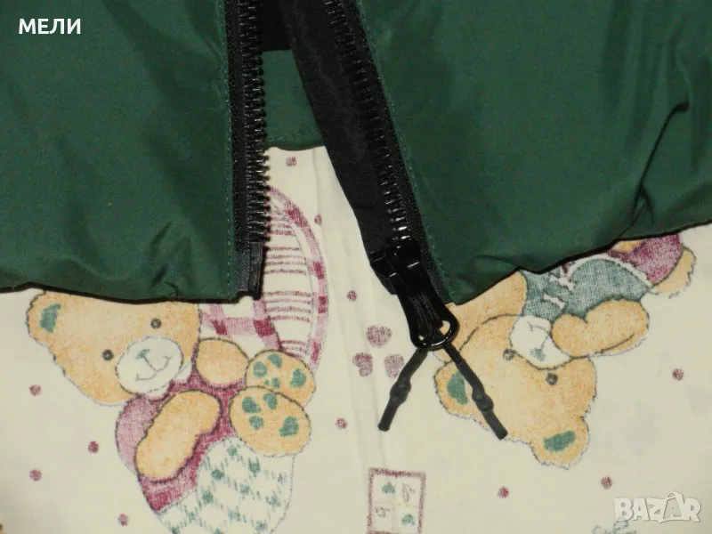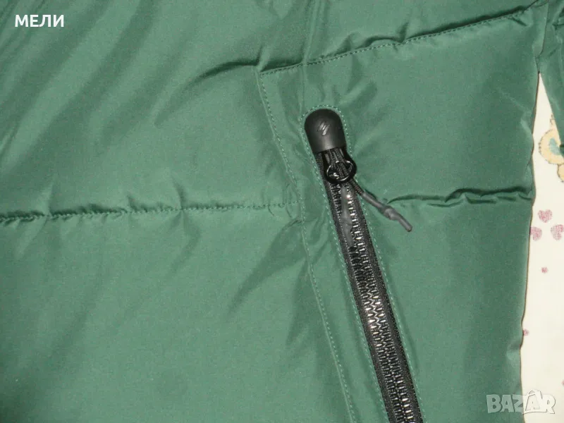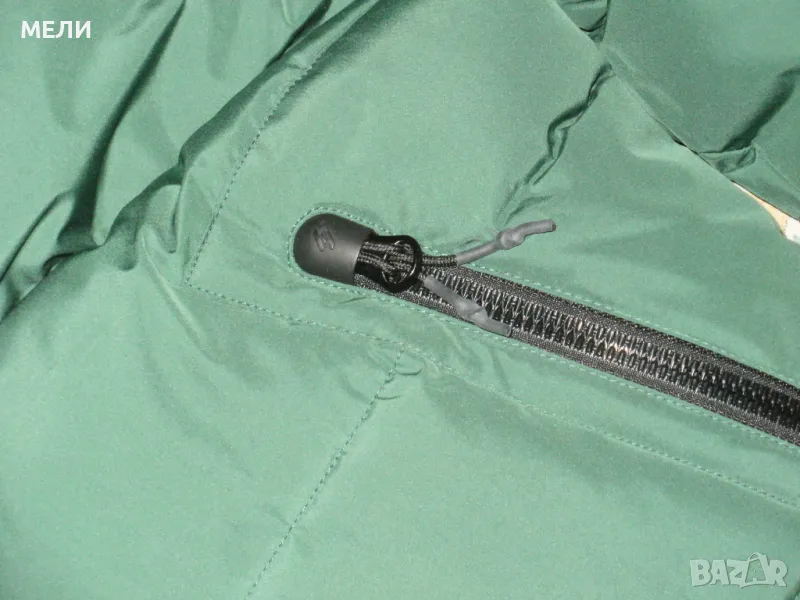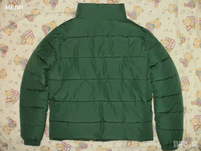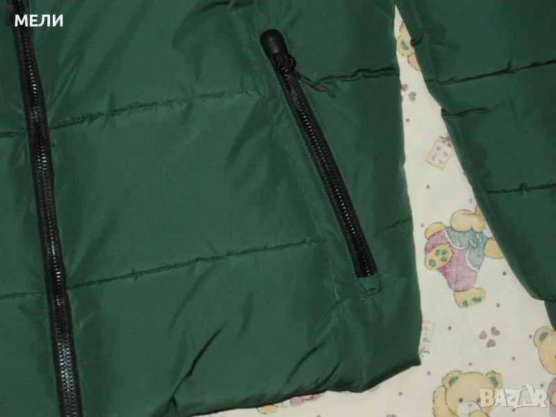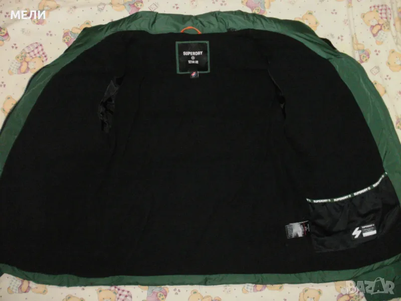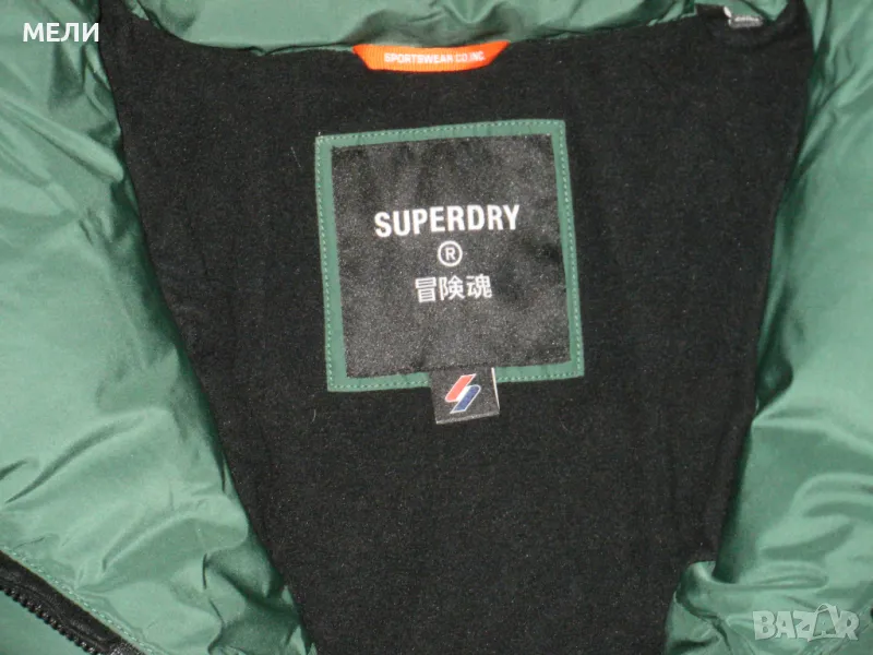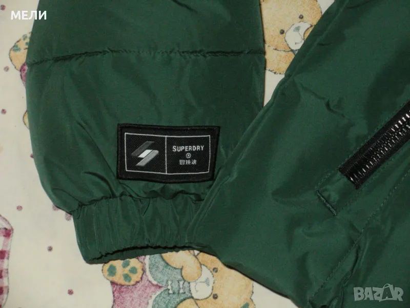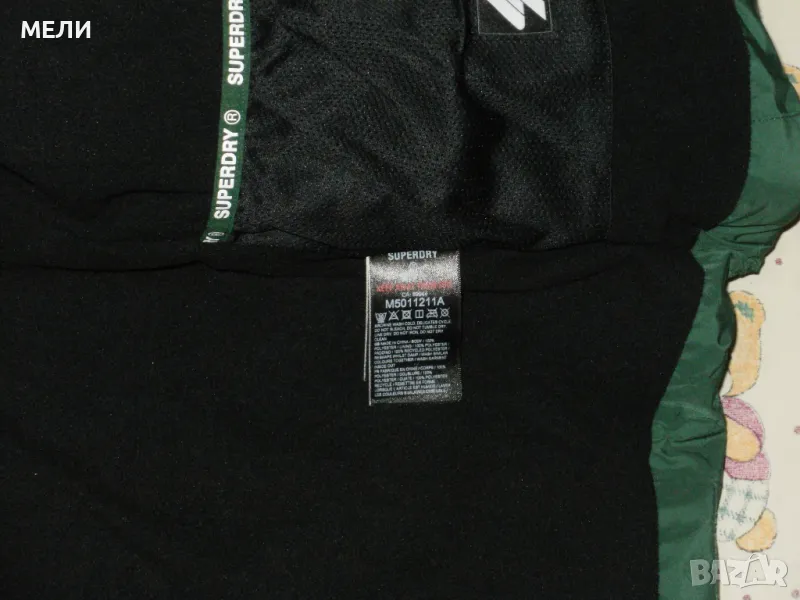 Якето е на SUPERDRY, оригинално, ново, номер XL но става и за L. Цвета е като на снимките зелено. Материята не пропуска дъжд и вятър. Закопчава се със стабилен цип, поларена подплата, пълнежа е силиконова вата. Долу има ластик със стопери. Отпред два джоба с ципове и един вътрешен.