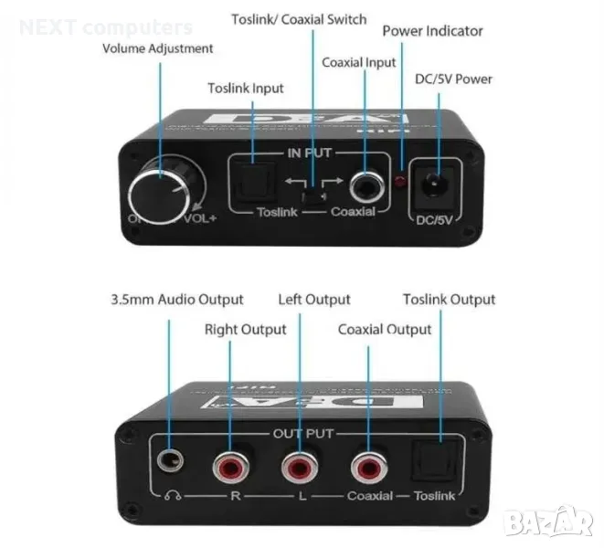 1. Преобразува Coaxial или Toslink дигитален аудио сигнал към аналогово L/R аудио.