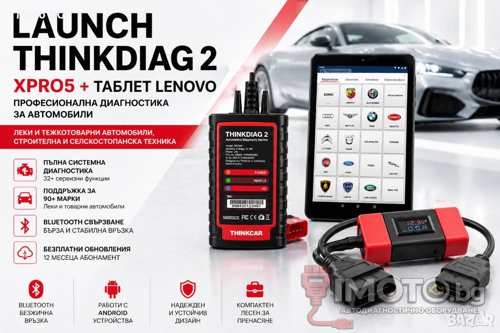 Launch ThinkDiag 2 е най-новият диагностичен тестер за автомобили от Launch, предназначен за Android устройства. Той предоставя пълен софтуерен пакет от Launch X431 Pro3S и предлага пълната функционалност на оригиналните фирмени диагностични тестери. С размери 8х5 см и тегло от само 50 грама, този Bluetooth диагностичен адаптер може да превърне вашия телефон или таблет в професионален уред за диагностика на автомобили. Поддържа над 70 световни марки, включително европейски, американски и азиатски производители, както и около 90 китайски марки.