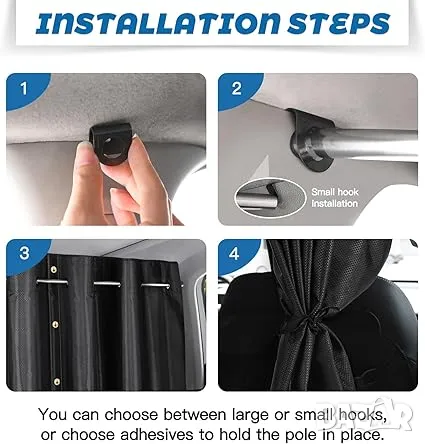 - Лесен за инсталиране: Просто щракнете куките в пролуките в стойката на каретата, закрепете телескопичния прът, след това вкарайте завесата в снадената напречна греда, поставете напречната греда в щипката в единия край, завъртете телескопичната пръчка, така че да щракне здраво върху куките в двата края и е готов за употреба