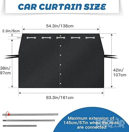 - Подходяща за повечето автомобили: Тази преградна завеса е с размери 107*161 см/42*63,3 инча, с фиксиран прът, който се простира на 145 см/57 инча в най-дългата си част. Подходящ за почти всички седани, джипове и багажници за пикапи