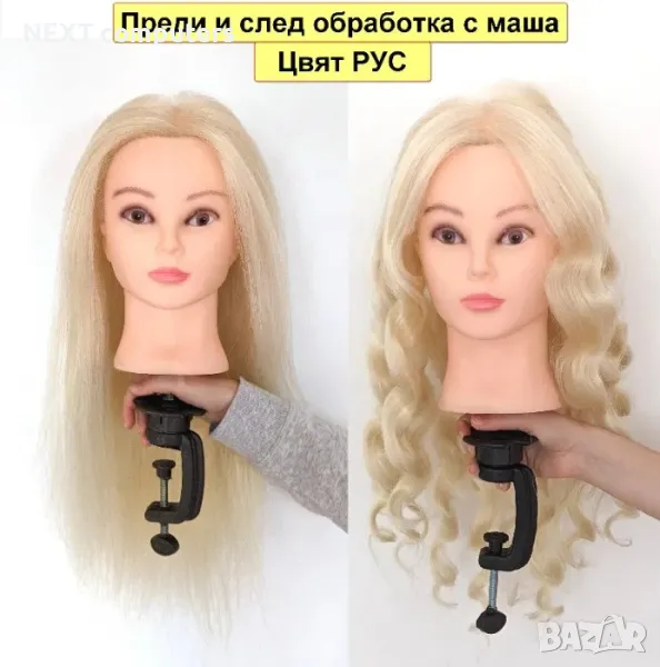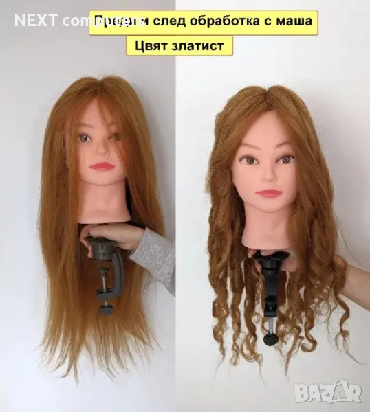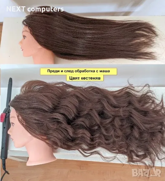 + НОВ манекен с ЕСТЕСТВЕНА коса за фризьорско обучение (тренировка) + СТОЙКА и фризьорски АКСЕСОАРИ